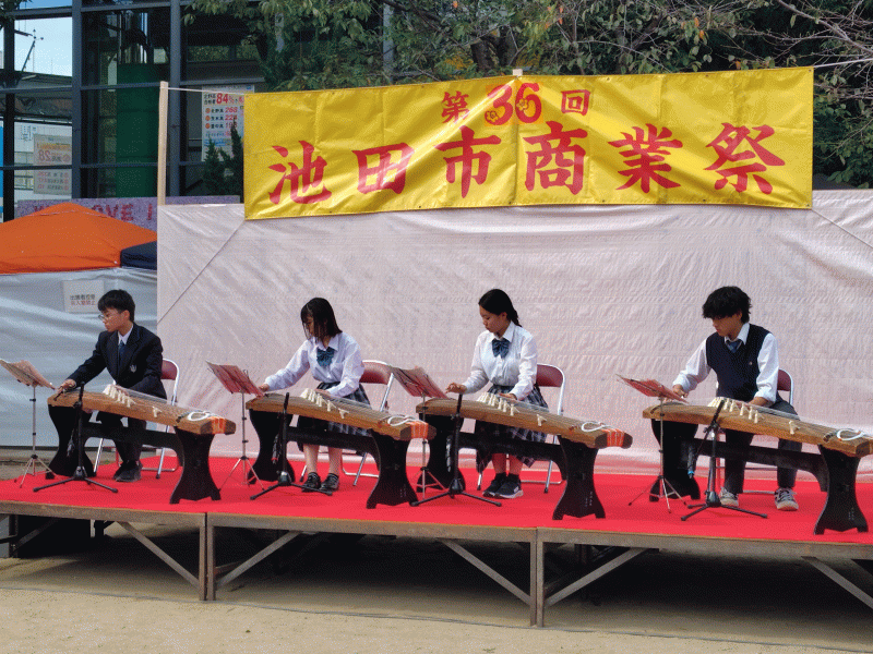 10月27日(日)池田市商業祭が池田駅前広場で開催され、本校 筝曲部、放送部、ボランティアの生徒14名が、参加させていただきました。