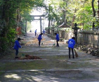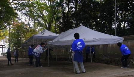 21日の準備では、境内や参道の清掃から始め、テントや椅子・机の搬入や設営、宣伝用ののぼりや場内案内用の掲示物の設置などを行いました。