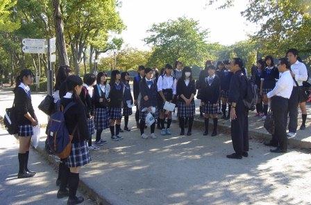 参加を希望をした生徒は、西俣稔さんの案内をうけながら、大阪城周辺の戦跡を1時間半をかけて巡りました。その後、ピースおおさかに入館して「大阪空襲と戦時下のくらし」と題した特別展等を見学しました。