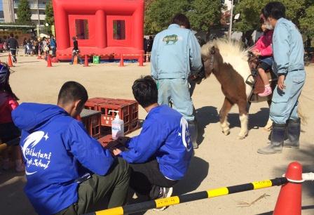 爽やかな秋晴れのもと、商店街の出店ブースのお手伝いや、ゲームコーナー、ポニー乗馬体験コーナーなどでのアシスト等を行いました。また、池田市のゆるきゃら「ふくまるくん」の体験もしました。