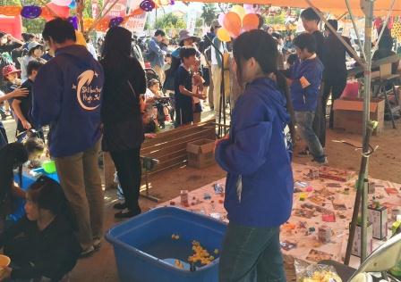 10月25日(日)に、石橋駅前公園で開催された池田市商業祭に、1年生5名と3年生9名が、ボランティアとして参加しました。