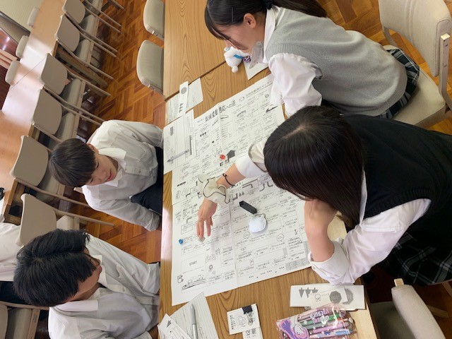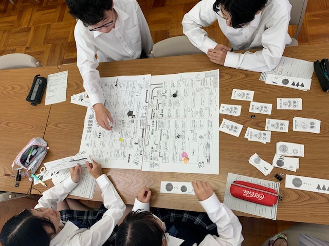 3年生の論理国語の授業の様子です。論理国語では「地球温暖化」をテーマに取り上げて学習をしています。この学習は、「地球温暖化」という理科分野の学びを論理国語と双方向に関連付けることにより、知識や技能を実際の多様な場面で活用する力が身につくものです。教科横断的な視点に立ち、今回は「すごろく」を用いて地球温暖化対策のための取り組みとして温暖化の原因となる物質(CO2)の排出を「緩和」する必要性や気候変動の悪影響を軽減することで「適応」する方策を検討しました。
