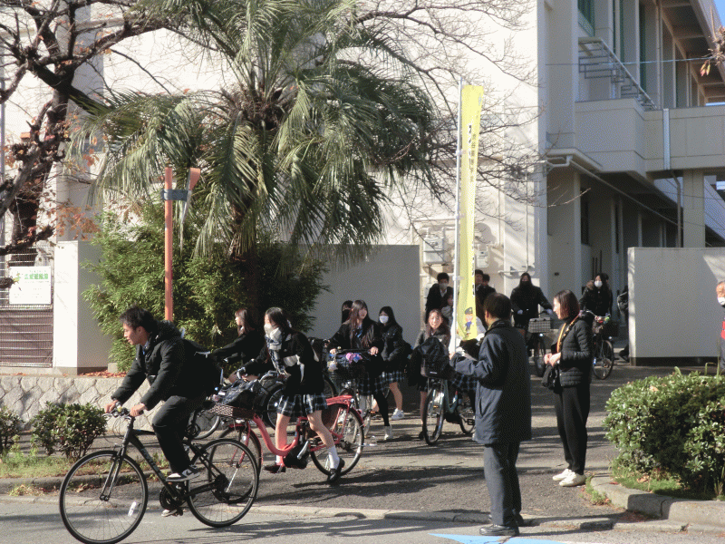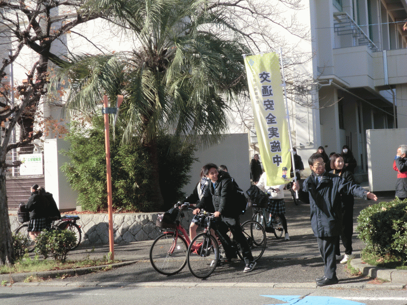 12月9日 期末考査終了後、生徒の下校時間に合わせ、PTA委員の皆様、生徒指導部の教員とで協力し、交通安全下校指導を行いました。