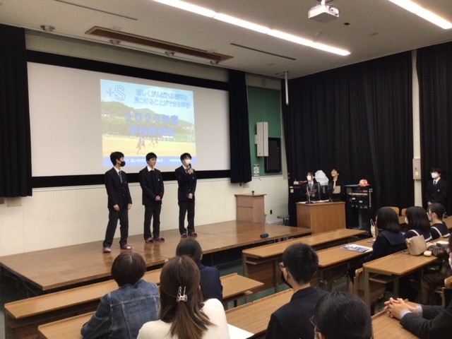 校長挨拶、生徒代表挨拶に続いて、今回は、有志および部活動(男子バスケットボール部・バドミントン部・ソフトボール部)代表生徒へのインタビューコーナーからスタートしました。
