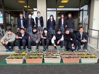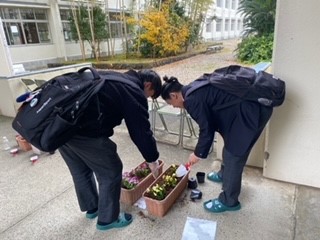 渋谷中学校様からいただいた紫と黄色のパンジーの苗の植え付けを生徒保健委員会の3年生が行いました。プランターに土と肥料を入れ、花に土がかからないように丁寧に植え込んでいきました。植え付けが終わったパンジーは正面玄関に飾られています。3年生は来学期を終えるといよいよ卒業です。保健委員会活動は今回の活動で最後となります。年間を通じて学校を美しくしてくれた3年生保健委員の皆さん、ありがとう。パンジーの代表的な花言葉はフランス語の「パンセ(思い/思想)」に由来し「もの思い、思い出」だそうです。保健委員会活動は、きっといい思い出となるでしょう。