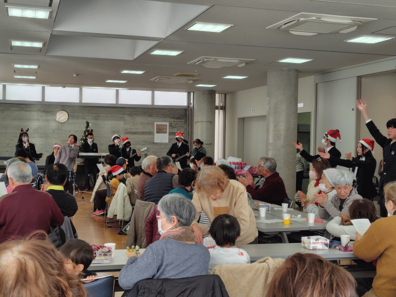 その中で、本校アコースティック音楽部員が、クリスマスソングや「上を向いて歩こう」等を生演奏し、地域の皆さんも小さな楽器を手に取り、みんなでリズムに合わせて歌いました。