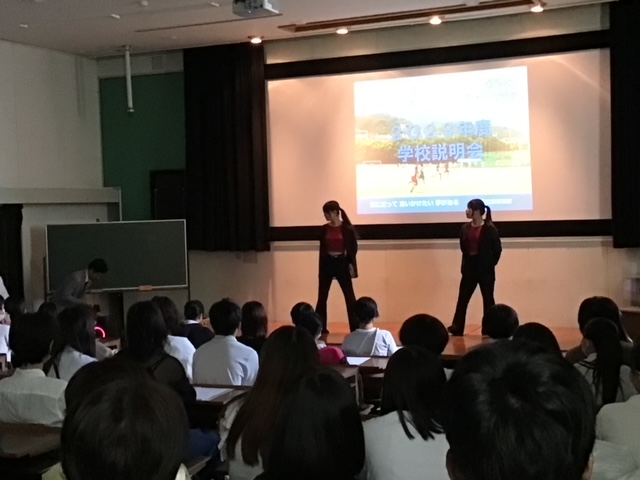 9月30日(土)、第2回学校説明会を開催しました。会場は満席で、中学生と保護者の方約150人にお越しいただきました。校長挨拶、生徒代表挨拶に続き、今回はアイスブレイクとして、渋高ダンス部によるヒップホップとジャズの2作品を披露させていただきました。3年生が引退し、2年生による新体制で挑んだダンス。リズミカルでかっこいいダンスパフォーマンスによって、あっという間に会場は熱気に包まれました。続いて、有志生徒たちによる学校説明と、校舎案内を行いました。