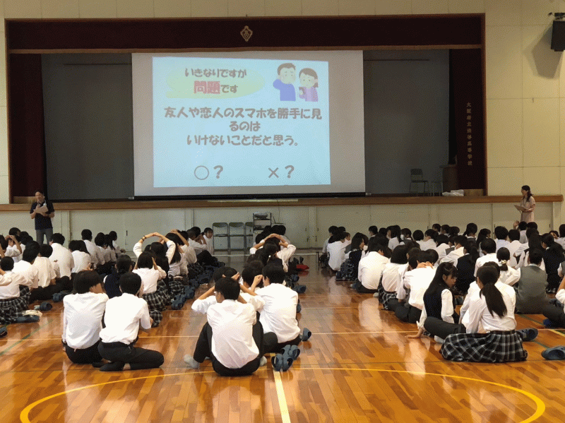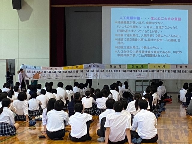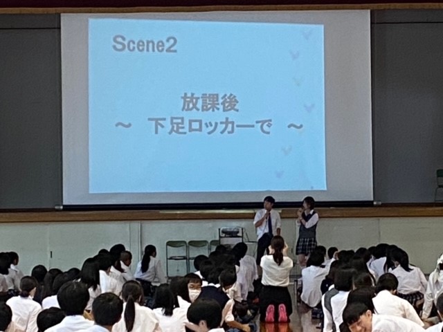 1年生は、「『セイ』との上手なおつきあい」とうテーマでLHRにおいて性教育講演会を行いました。養護教諭によるレクチャーと簡単な〇×クイズの後、1年生担任団による、ケーススタディの寸劇を行いました。先生方のなりきった演技で体育館内はとても盛り上がりました。性に関する正しい知識を身につけ、デートDVや性に関する健康問題などで困ったとき、信頼できる大人に相談する大切さを学ぶことができました。
