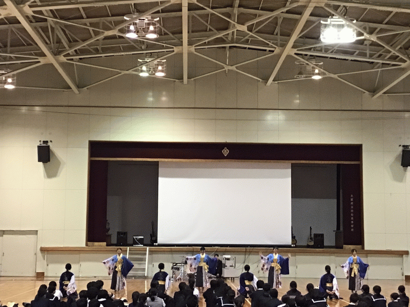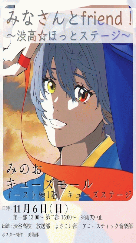 放送部の司会で始まり、アコースティック音楽部による楽曲披露とよさこい部による演舞、そしてこのイベントに向けて美術部がポスター制作を担当しました。