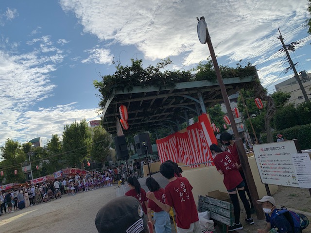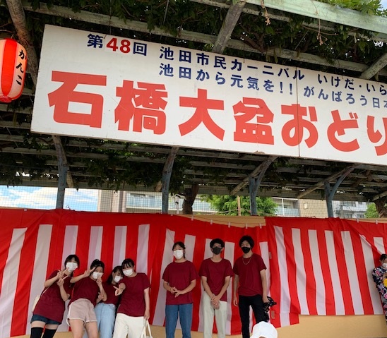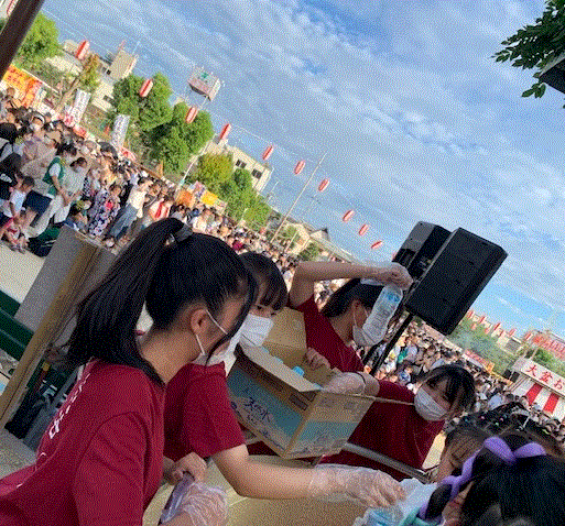 この写真は、2日目の様子です。お祭りのステージ発表終了後、飲み物を配布している様子です。ステージは熱気に溢れ、そのサポートに一生懸命取り組んだ有志メンバーたち。地域の方々からも感謝のお言葉をたくさんいただきました。地域ボランティア活動から得たことは、今後のキャリア形成に大きく役立つことでしょう。
