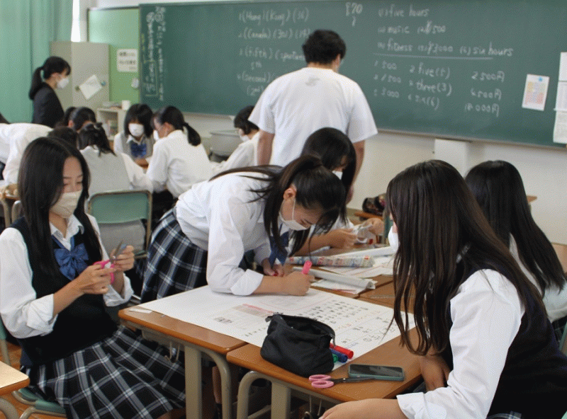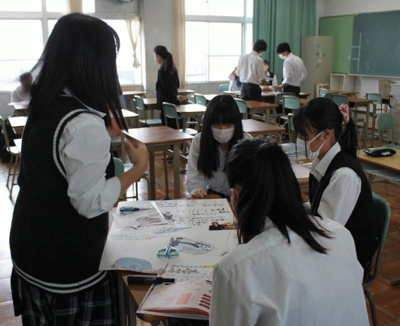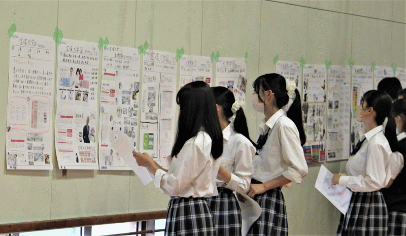 2年生は、前週に訪問した大学や専門学校について、少人数のグループに分かれて、学校紹介のポスター作りを行いました。聞いたことや学校紹介パンフレットなどを使って、それぞれ趣向をこらしたポスターになりました。