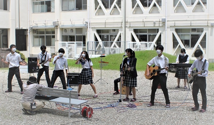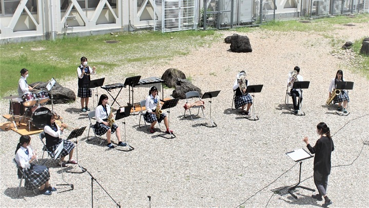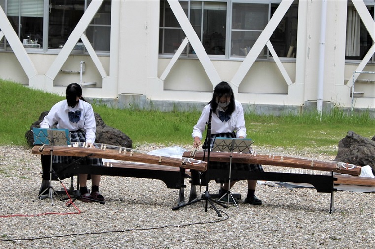 一学期終業式、恒例のミニライブを開催しました。中庭にて、吹奏楽部・筝曲部・アコースティック音楽部が、それぞれ演奏する時間をもちました。