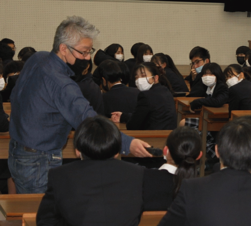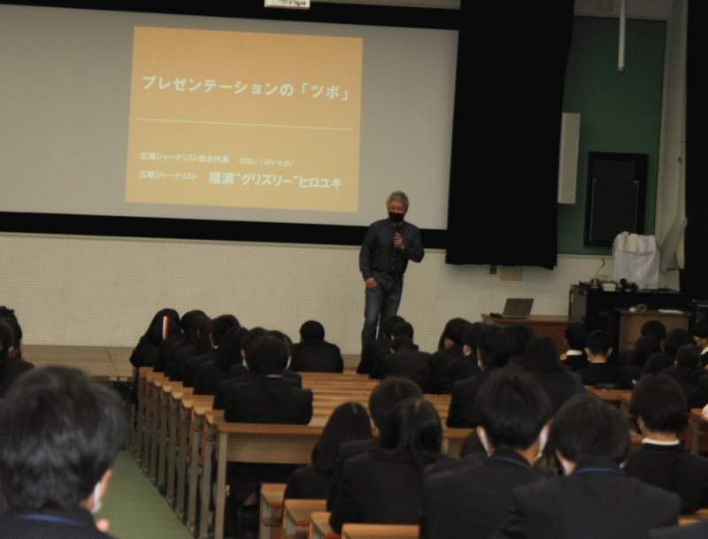 1年生の総合的な探究の時間では、探究活動の個々のスキルの基礎講座として展開してきましたが、今回はプレゼンテーションについてです。「広報ジャーナリスト協会」代表の福満ヒロユキ先生にお越しいただいて、『プレゼンテーションのツボ』と題して、他者の心に伝わる発表のポイントをお話していただきました。
