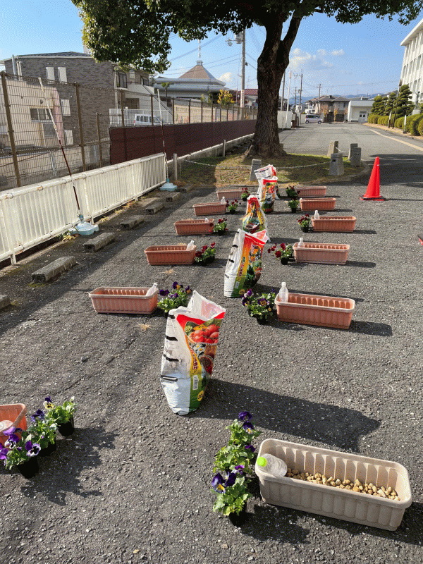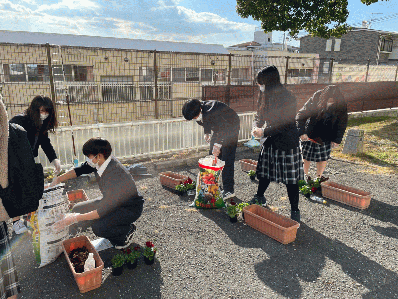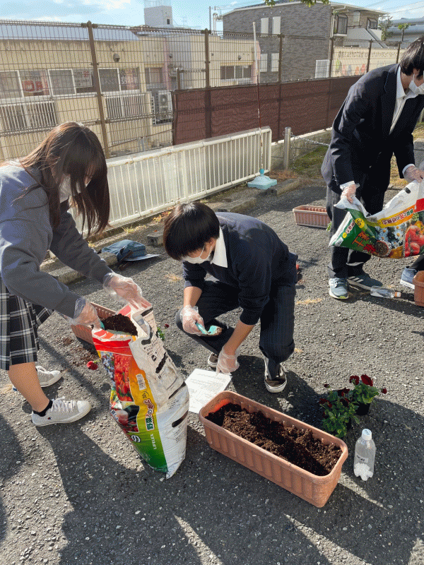 11月26日に渋谷中学校様で行われた「令和3年度 花いっぱい運動 出荷式」でいただいたパンジーの苗を、3年生の保健委員が植えました。