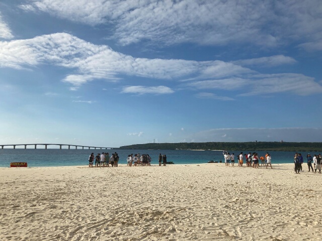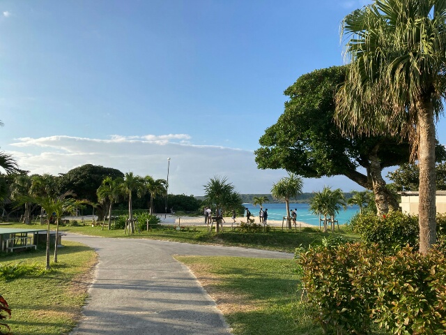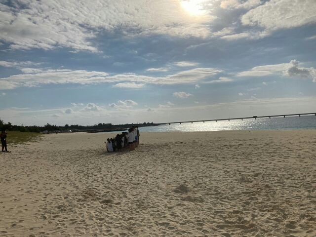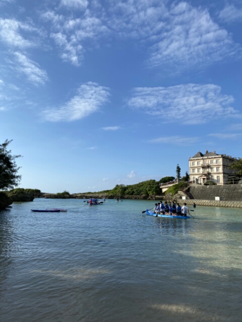 天気は晴れ。マリン体験組は前浜ビーチで、バナナボートとマーブルボートに乗っています。
