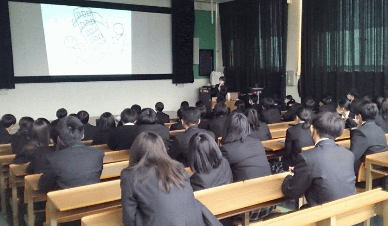 1年生のホームルームの時間、「ネットに潜む被害・加害の現状と今できること」と題して、NIT情報技術ネットワークの筒崎眞美先生にお話ししていただきました。ネット対応アドバイザーとして日々活動されている先生からの、これまで対応された具体的な被害や加害の事例を交えてのお話は、似たような事柄を感じさせることもあり、聞き逃せない時間となりました。また、自分を守るために、今できる具体的なアドバイスもいただき、安心することもできました。