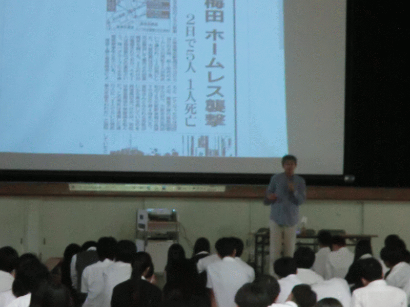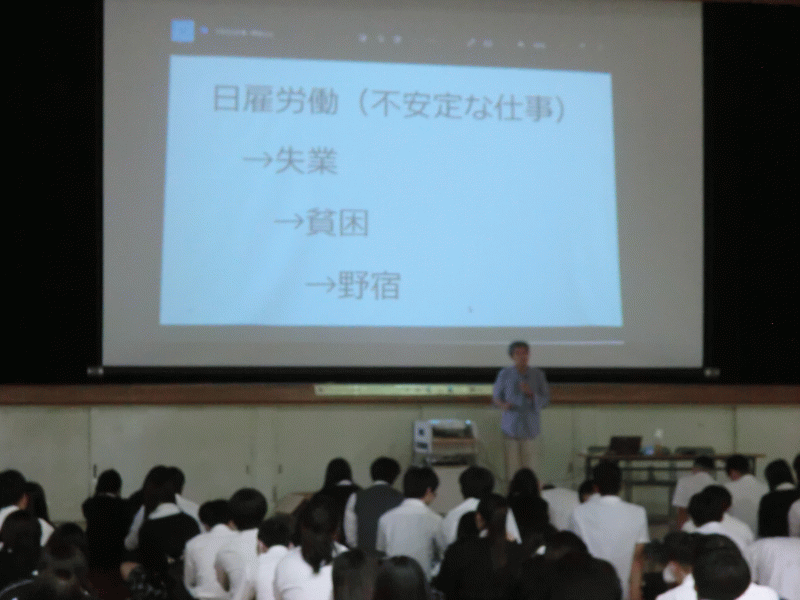 10/2(木) 3年生は、野宿者ネットワーク代表 生田武志さんをお招きして、貧困問題をテーマに人権講演会を開催しました。 野宿者の厳しい状況や差別・偏見による事件等について詳しくお話を聞かせていただきました。