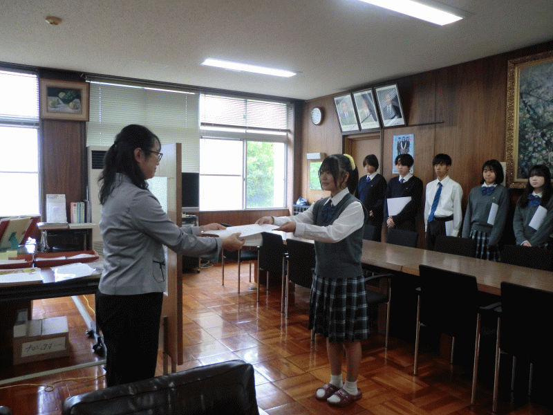 10月15日(水)中間考査最終日、生徒会執行部後期役員候補の立会演説会、信任投票、開票が行われ、全員信任されました。そして、翌週の10月21日(火)に、新役員の認証式が校長室にて行われました。新役員一人一人に、校長より認証状が授与され、生徒会新執行部が誕生しました。