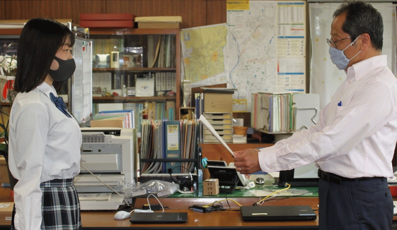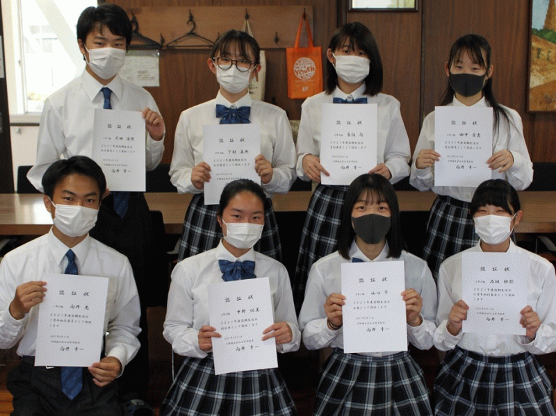 2021年後期の生徒会役員選挙を行いました。結果は全員が承認され、校長室で認証式を行いました。生徒会長から順に認証状をお渡しし、最後に記念撮影をしました。まずは8名で協力して、立会演説会で決意表明されていた事柄を、じっくりと実行に移していってもらいたいと思います。
