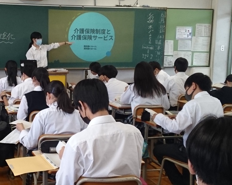 三週間の予定で、先月末から2名の卒業生が教育実習に来ています。最終週に入り、研究授業を行いました。一人は保健の授業で、「妊娠・出産と健康」の単元、もう一人は家庭科で「高齢社会を生きる〜介護保険制度」の単元でした。