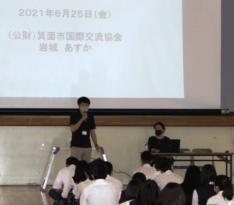 2年生の総合的な探究の時間では、箕面市国際交流協会の岩城あすか様にお越しいただき、「私と多文化共生について考える」と題して、お話をしていただきました。