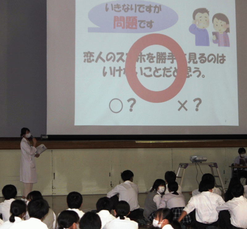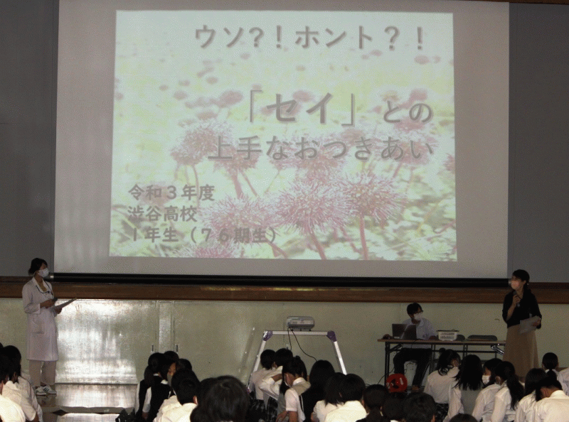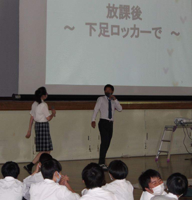 1年生は、「『セイ』との上手なおつきあい」と題したホームルームの時間をもちました。養護教諭によるレクチャーと簡単な質問形式での整理の後、1年生担任団による、ケーススタディの寸劇を行いました。テーマの内容は当然のこと、先生方のなりきった演技に、生徒は興味を抱いての学びの時間となりました。