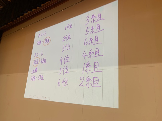 結果は、優勝3組、準優勝5組、3位6組、4位4組、5位1組、6位2組でした。