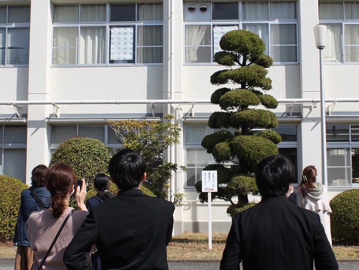 令和3年度入学者選抜の合格者の発表を行いました。10時に校舎南館の窓ガラスに、合格者240名の受験番号を掲示しました。自分の番号を見つけた受験生からは、歓声の声もあがりました。携帯電話で番号を写す受験生や、喜びの声を伝える受験生など、多様な光景を見ることができました。コロナウイルス感染症防止の観点から、大きく間隔をあけての発表となりましたので、受験番号の掲示場所を探す場面もありました。