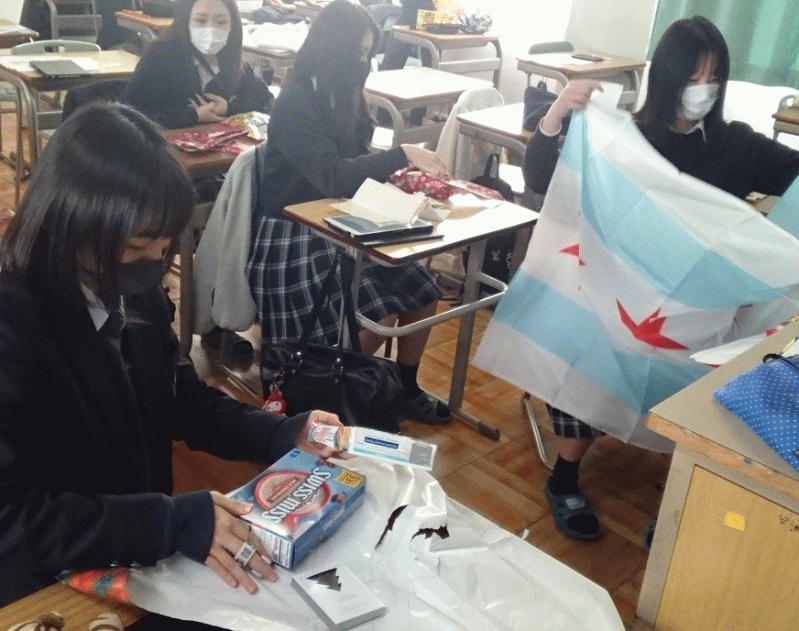 3年生の選択科目「実用英語」の時間では、日本語を学ぶアメリカの高校生との交流を行っており、昨年末には「おみやげエクスチェンジ」の準備を行いました。それぞれがバディを想ってのプレゼントを包装してアメリカに送りました。
