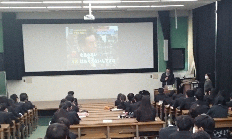 3年生の「現社クローズアップ」の授業では、フリージャーナリストの西谷文和さんをお招きし、「メディアの役割」と題してお話をしていただきました。中東やアフリカを取材された体験をもとに、湾岸戦争やアフガニスタン和平を素材に、メディアリテラシーの大切さをひもといていただきました。映像を交えて、説得力のあるお話しに聞き入り、これからの自分たちの姿勢を考えるきっかけとなりました。