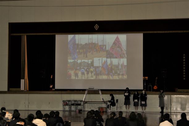 校長挨拶、生徒会長挨拶に続き、スライドを使っての、生徒会による学校説明です。