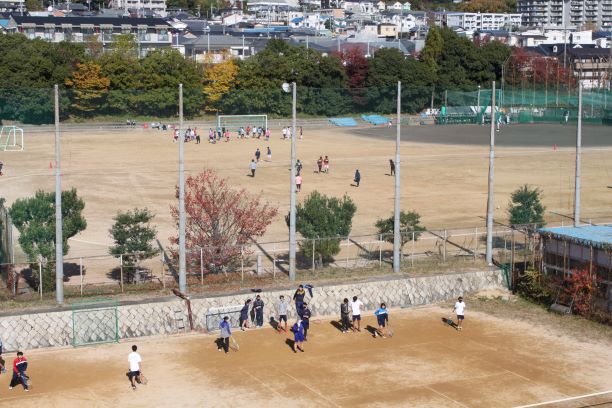 グランウンドでの体験部活動の様子です。サッカー部、テニス部、ラグビー部が熱心に活動をしています。