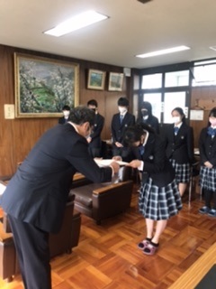 一人ずつ順番に校長先生から認証状を受け取りました。その後、執行部は校長とともに昼食をたべながら自己紹介をし、今後の抱負を語りました。学校生活や生徒会企画イベントについて、やりたいことなど話が広がりました。 今日より、2年生4人と1年生4人の新執行部が発足しました。