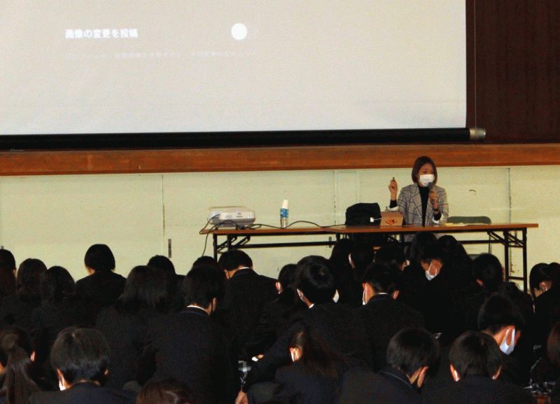1年生のホームルームの時間には、NIT情報技術推進ネットワークの方にお越しいただき、「ネットに潜む被害・加害の現状と今できること」と題して、講演していただきました。生徒は自分のスマートフォンを手に持ちつつ、講師の方の説明に従って、被害に逢わない為に対応できることを確認していました。また、長い目で見て取り扱いに注意すべき事柄についても、多くの助言をいただきました。