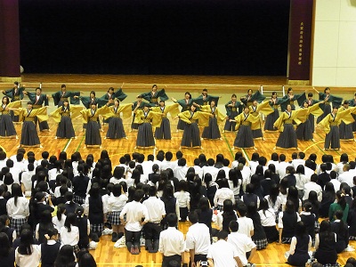 雨のため放送での閉会式となった体育祭でしたが、プログラムの最後に予定されていたダンス部とよさこい部の演舞披露を、本日、体育館で昼休みに行いました。