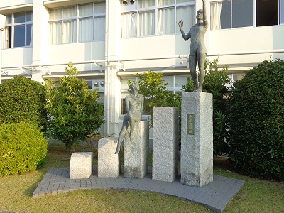 写真 左は中庭に咲いたツワブキ 平成2年硬式野球部夏の甲子園出場記念碑 右は創立80周年記念モニュメント「未来への階段」