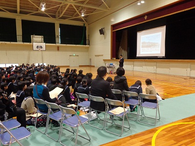 3年生は講演会といっても、ただ聞くだけでない参加型のものでした。講師は箕面市のライトピア21で活動されているNPO暮らしづくりネットワーク北芝スタッフの8名の方です。2クラスごとに4つの部屋に分かれて子育て、介護などについての講師の問いかけに生徒がグループで考え、発表し、最後に講師から実際に地域で取り組まれていることがらについて紹介がありました。