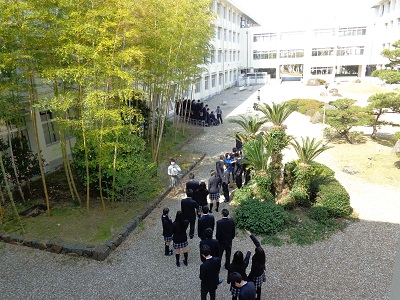 校門脇のソメイヨシノは先週末の風雨にも耐えて、入学式にはなやぎを添えてくれました。今は中庭の桜がいよいよ盛んです。渋高の北側にある五月山の山並みにもところどころ桜色に染まっています。これからしばらく人にも自然にも、若い息吹の感じられる季節です。