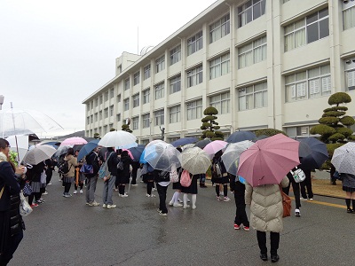 傘の花が咲くなか、午後2時に前期入学者選抜の合格者発表を行いました。悲喜こもごもの光景でした。