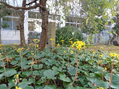 写真 左は中庭に咲いたツワブキ 中は東門にある「自由と規律」の碑 右は体育の授業風景