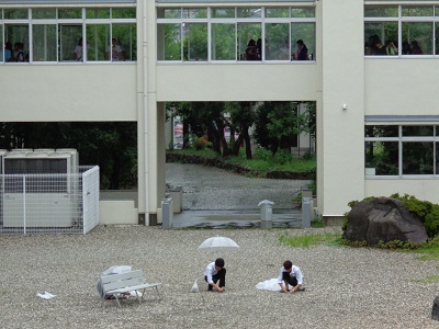 でも、こちらはまだまだ落ち着くどころか、文化祭をあわただしく準備しています。特に今日は雨のために運動部も校舎内での練習となっていますのでとてもにぎやかです。