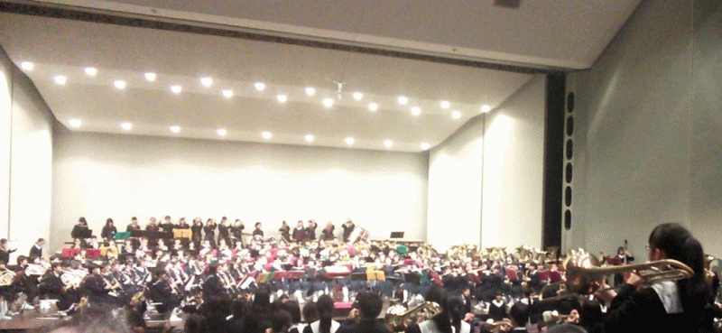 高校と中学校の組み合わせによる4チームと高校合同演奏、中学校合同演奏のステージが2時間半にわたって行われ、最後は、通路もすべて埋め尽くした参加者全員による演奏が場内に響き渡りました。