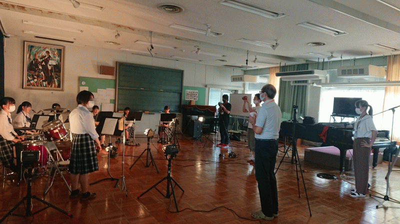 8月21日(金)に、ライブ配信予定のコンサートのための撮影が音楽室で行われました。 日頃の練習場所にも関わらず、色々な機材に囲まれての演奏だったので、少し緊張しました。 連続テレビ小説「エール」の主題歌GReeeeN『星影のエール』を演奏しました。 ライブ配信では、様々なイベントの配信が予定されています。 ぜひ、ご覧ください♪