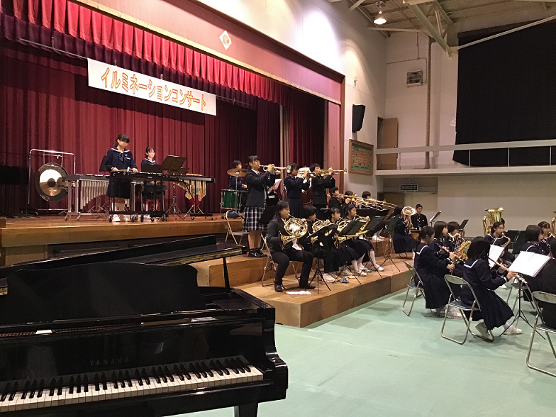 12月24日には、緑丘小学校の体育館で、第20回目のイルミネーションコンサートが開催されました。渋吹は、渋谷中学校との合同演奏で参加し、坂本九さんやサザンオールスターズのメドレーを演奏するほか、出演者全員による合唱「翼をください」「花は咲く」の伴奏をしました。毎年、心づくしの豚汁がふるまわれ、イルミネーションも美しく輝く恒例行事で、満員のお客様と楽しいひと時を過ごしました。