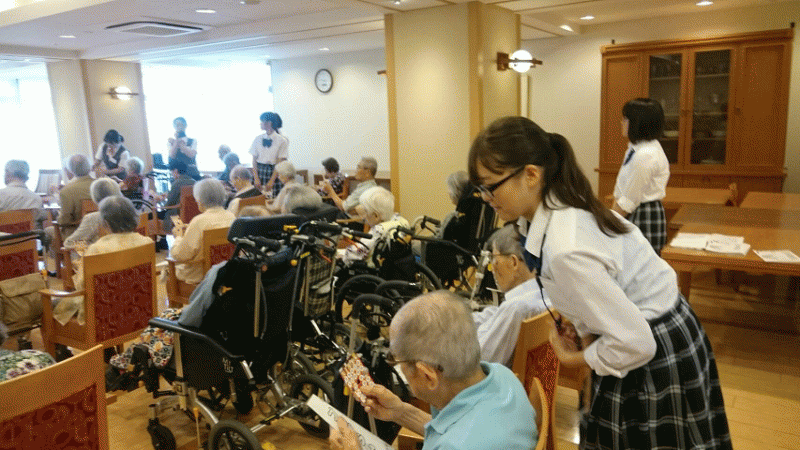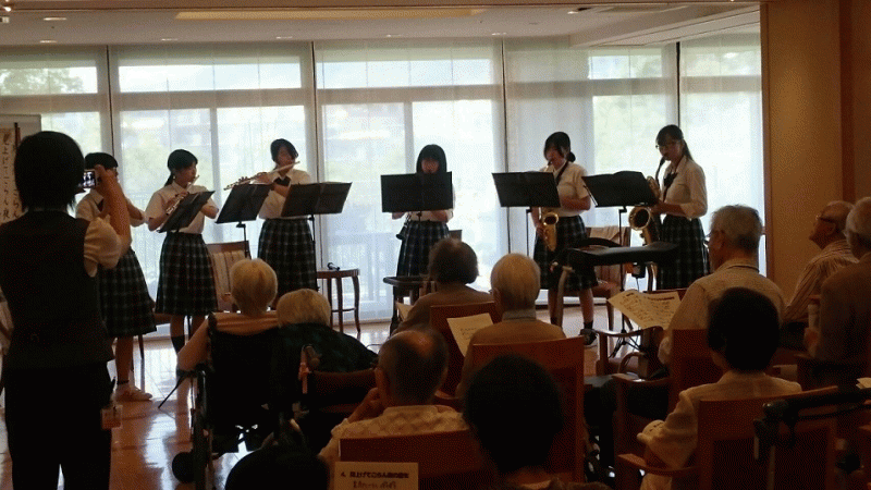 8/2(水)に、グッドタイム リビング 池田緑丘でミニコンサートを開きました。 私たちの演奏に入居されている方々の歌が加わり、馴染みのある曲を皆で楽しむことが出来ました。