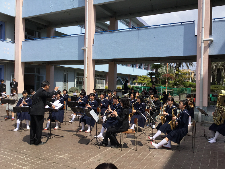 吹奏楽部の新年度のスタートは、渋谷中学校でのさくらまつり出演です。 毎年、4月の始めの土曜日に、中学校の中庭で、渋谷中学校吹奏楽部との合同演奏をします。