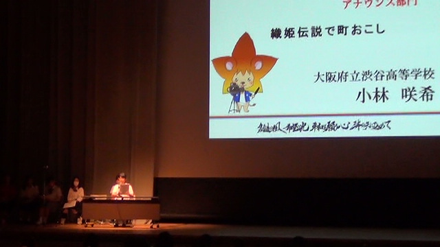 私は、住んでいる大好きな池田市に古くから伝わる織姫伝説を伝承しながら世代を超えて人が繋がる町にしたいという人々の思いを伝えました。
