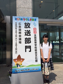 8月1日から3日まで、広島市の平和祈念公園横にある広島国際会議場で、第40回全国高等学校総合文化祭放送部門が行われ、私、3年生小林咲希がアナウンス部門の大阪代表の一人として出場しました。アナウンス部門は、郷土の話題を全国の高校生に伝えるもので、今回は、継承がテーマです。
