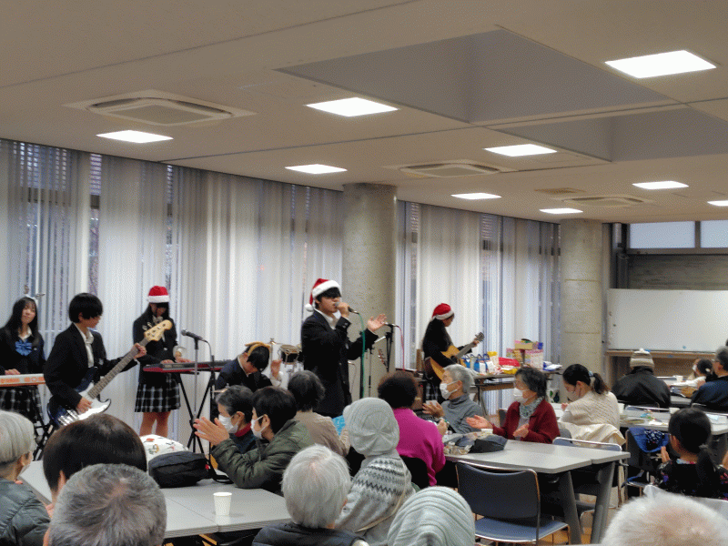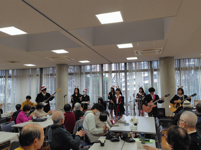 その中で、アコースティック音楽部員が、クリスマスソングや「上を向いて歩こう」等を生演奏し、地域の皆さんも小さな楽器を手に取り、みんなでリズムに合わせて歌いました。