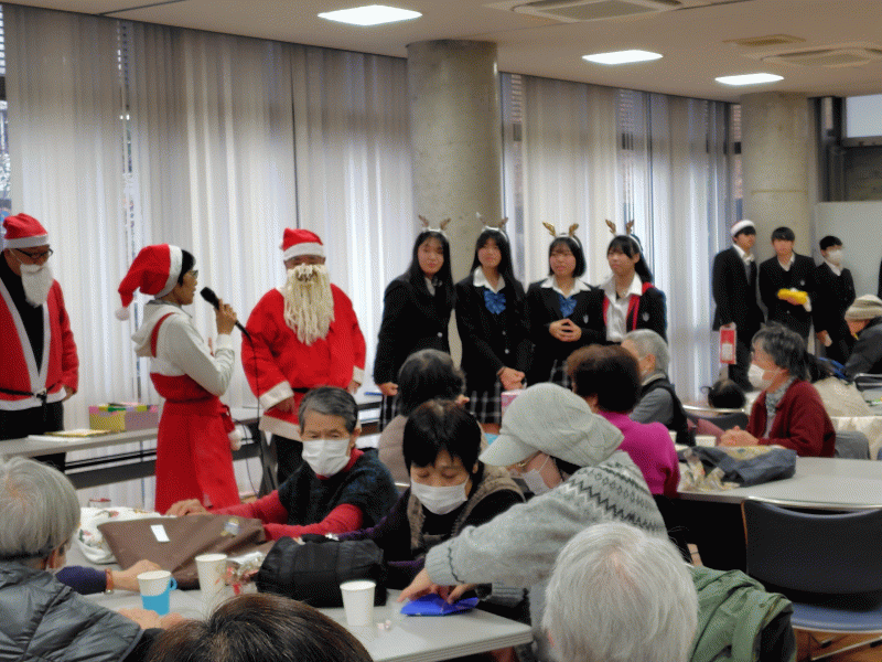 12月21日(日) 本校アコースティック音楽部が 五月丘地域コミュニティ推進協議会主催のクリスマス会に参加しました。地域住民の方70名ほどが公民館に集まり、クリスマスのイベントが行われました。